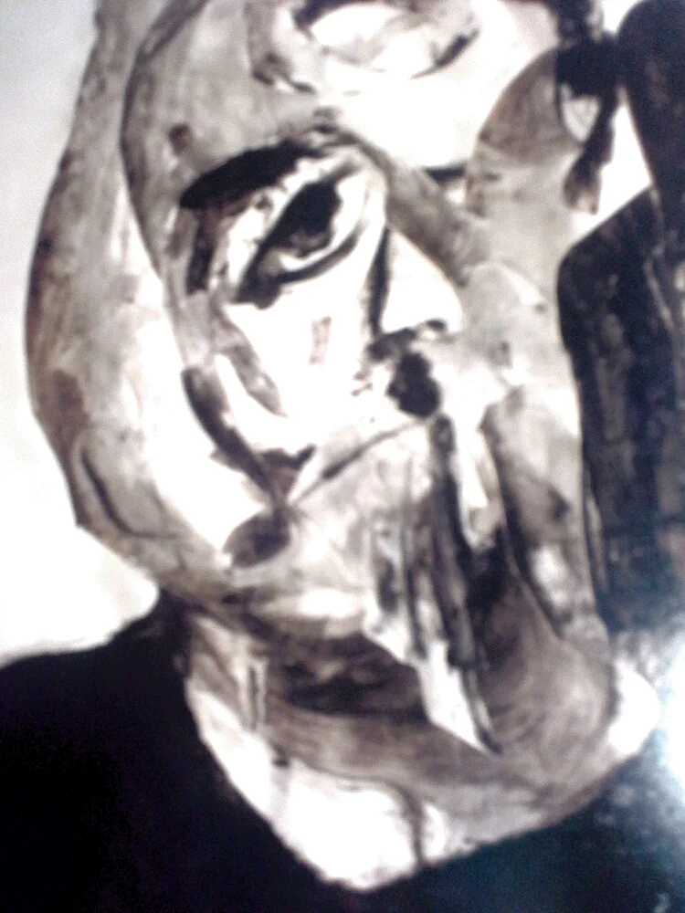 Support and dimension : A previous sheet of paper with a self-portrait made with dark pigment, later cut into abstract shapes. Re-elaborated and pasted into a new trans-figured self-portrait. Dimensions: 2 sheets of A1 paper. Final artwork digitally manipulated. Subtitle : The potrait with suspended dark dressed girl, an angel and musical note.